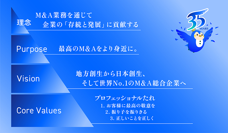 私たちは、創業35周年を「第二創業」の機会だと考えています。M&Aを取り巻く環境はこの数年で大きく変化し、社会から求められる役割や責任のあり方も多様化しています。こうした状況を踏まえ、さらなる事業基盤の強化と、提供価値の向上を図るため、改めて自社のあり方を見つめ直しました。その取り組みの一環として、今回新たに「ビジョン」と「コアバリュー」を制定しました。