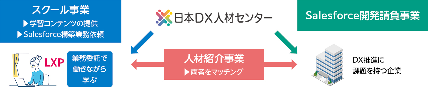 日本DX人材センターは2024年2月に設立され、「人の力は社会を変える」というビジョンのもと、Salesforce開発請負やDX人材育成、人材紹介事業を手掛けています。DX人材育成・人材紹介事業においては、未経験の人材に学習と実践の機会を提供し、経験を積んだ状態で即戦力として企業に人材を紹介するのが大きな特徴です。