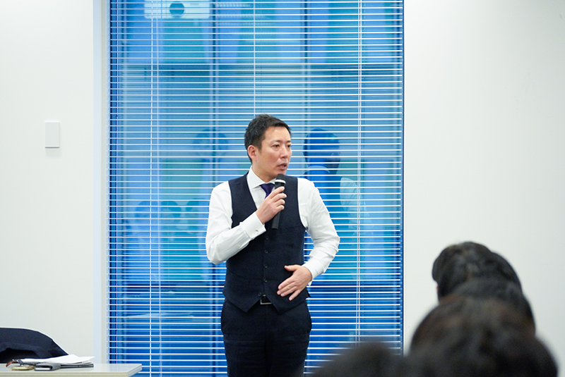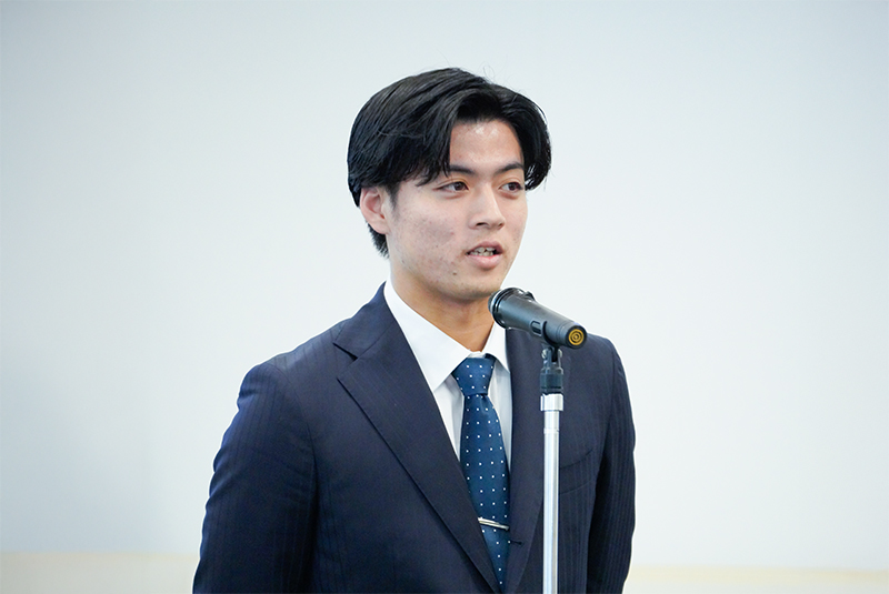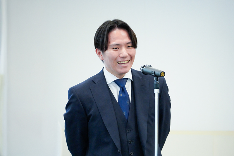 辞令交付後には、日本M&Aセンター 鈴木 康之専務取締役が激励を送りました。決意表明後には、日本M&Aセンター 竹内 直樹代表取締役社長が、「皆さん1人1人の表情や決意表明を受けて、私自身も社長として皆さんの期待に応えていきたいと決意を新たにしました」と語り、「仮配属の7カ月間お世話になり、社会人としての基礎を教えてくださった先輩方に感謝の気持ちを伝え、残り1カ月の仮配属の1日1日を大事に過ごしてほしいです」とエールを送りました。