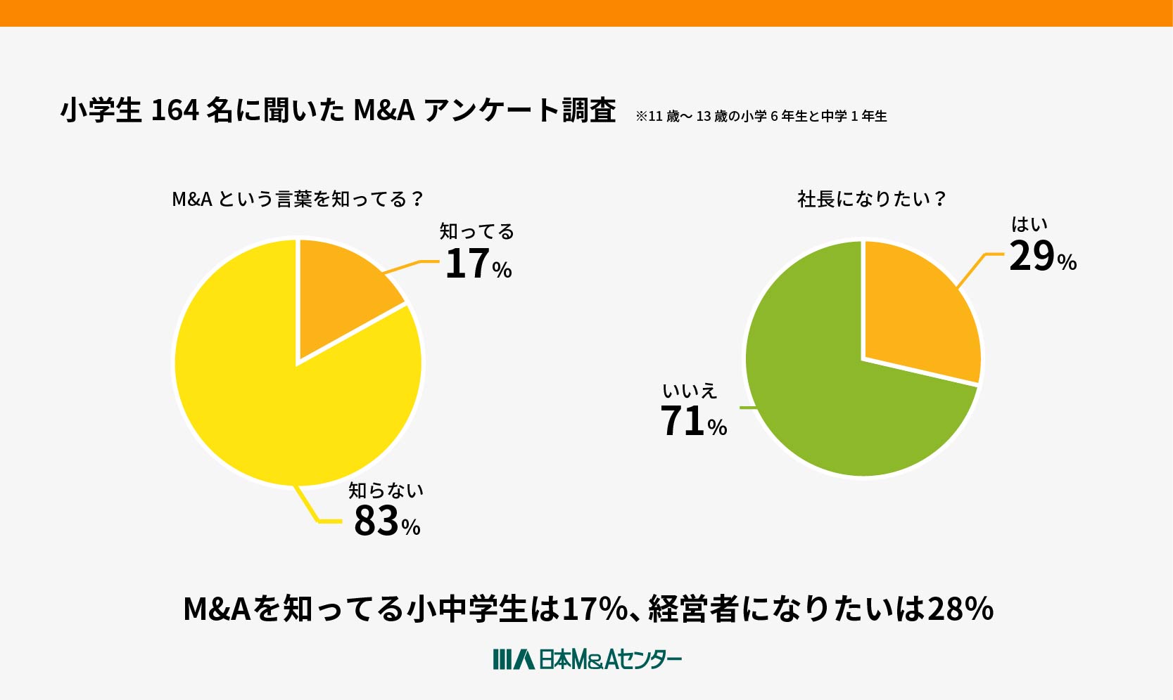 日本M&Aセンターは、小中学生(小学6年生・中学1年生)を対象に、M&Aの認知度を探る初のアンケート調査を行いました。その結果、M&Aを知っていると回答した子どもたちは17%に達したほか、「社長になりたい」と答えた子どもたちは28%で、経営者に対する関心が一定程度存在することが示されました。