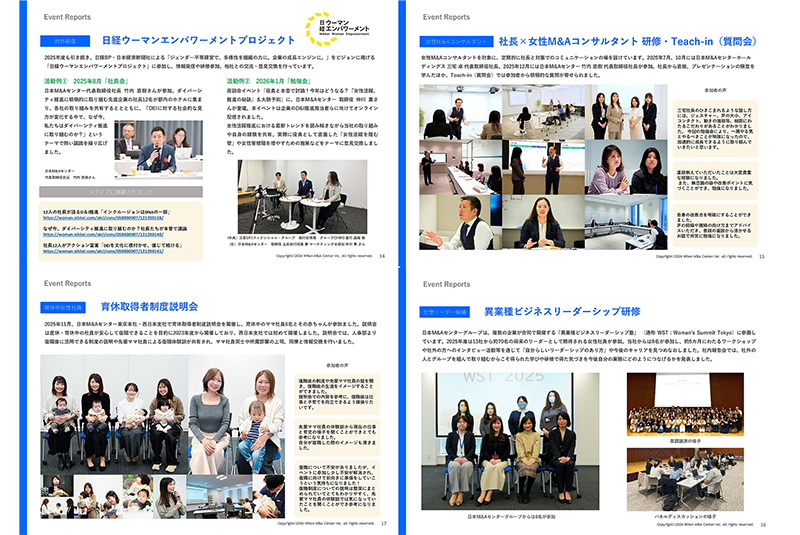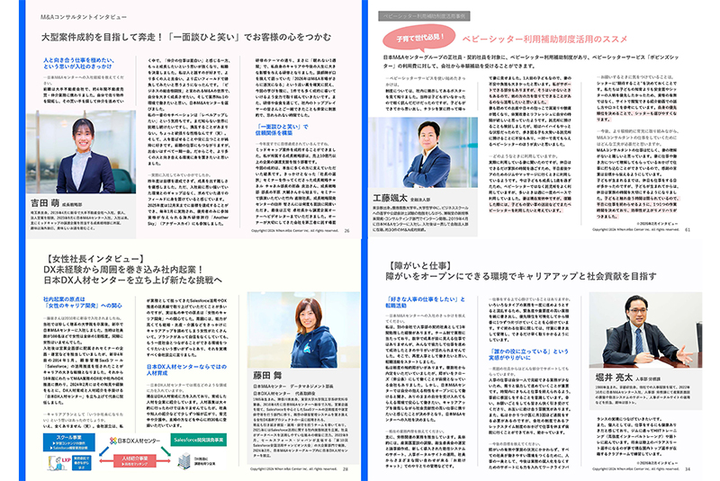 本冊子は、こうした取り組みを広くお伝えすることを目的に制作しており、今年で4回目の公開となります。本冊子を通じて、社員がキャリア形成やライフプランを具体的に考える際の一助となることを期待するとともに、日本M&AセンターのD&I推進に対する姿勢を社内外に発信しています。